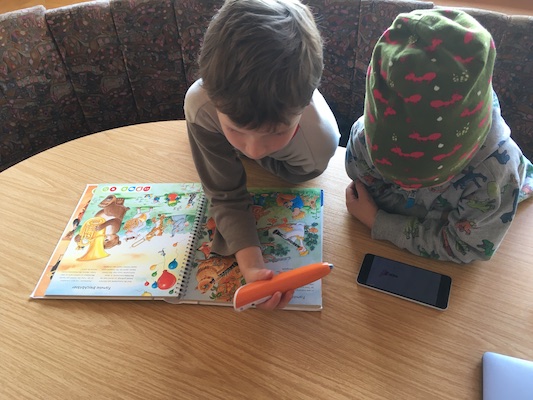 Inzwischen schnappten sie die Kinder aber das Handy und holten ihr Buch und verglichen die Musikinstrumente, die zu sehen waren. Voller Freude jubelten sie, wenn sie eines erkannten: Posaune, Horn, Klarinette, … .